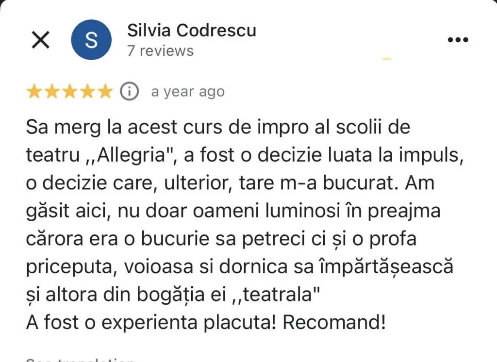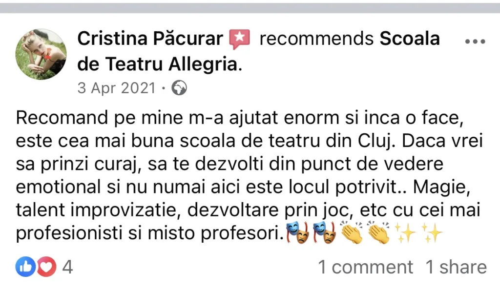 „Cursul de improvizație a fost cea mai bună alegere pe care am făcut-o, și nu doar pentru că m-am regăsit la acest curs, că mi-am dat frâu liber emoțiilor și m-am simțit într-adevăr bine, ci și pentru că am ieșit din zona de confort. Am reușit să-mi fac prieteni. Am avut posibilitatea să învăț de la actori de la teatrul din Cluj și am avut parte de experiența de a urca pe scenă. Vă recomand tuturor să veniți la cursul de improvizație organizat în cadrul Școlii de Teatru Allegria, pentru a vă simți și voi bine și pentru a vă deschide noi orizonturi.” – Irina Solomon